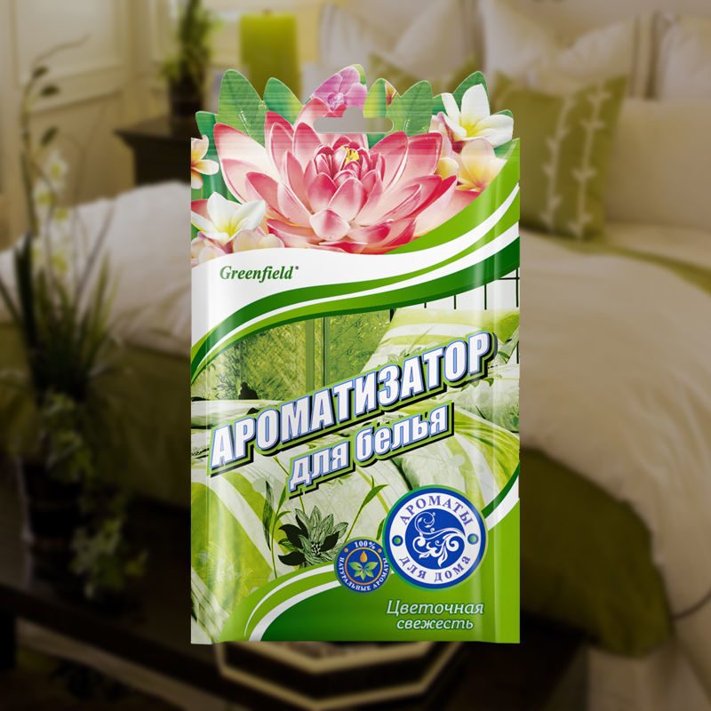 Greenfield ароматизатор **Цветочная свежесть** - превосходный аромат для хорошего настроения в Вашем доме. Освежитель-ароматизатор воздуха для придания натуральной свежести - зеленый чай, хлопок, эдельвейс в жилых и офисных помещениях, платяных и бельевых шкафах, ванных комнатах, санузлах, салонах автомобилей и т.д. Способ применения: Откройте упаковку. Достаньте бумажный пакетик с ароматическим саше. Внимание! Бумажный пакетик с ароматическим саше, не вскрывая, положите в ящик для белья, комод или в платяной шкаф.